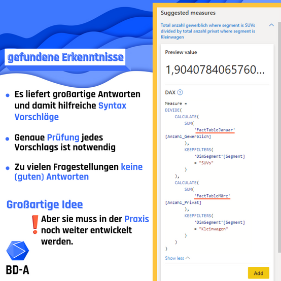 #PowerBI liefert uns nicht nur die Antwort – das war ja schon vorher durch das Q&A Feature möglich – nein, es liefert einen ganzen CodeBlock in #DAXdazu. Hier ist ein #NLP#KI-Algorithmus am Werk der Sprache zu Programcode verwandelt und das ist besonders interessant für alle, die mit #DAX noch nicht ganz warm sind. 💡